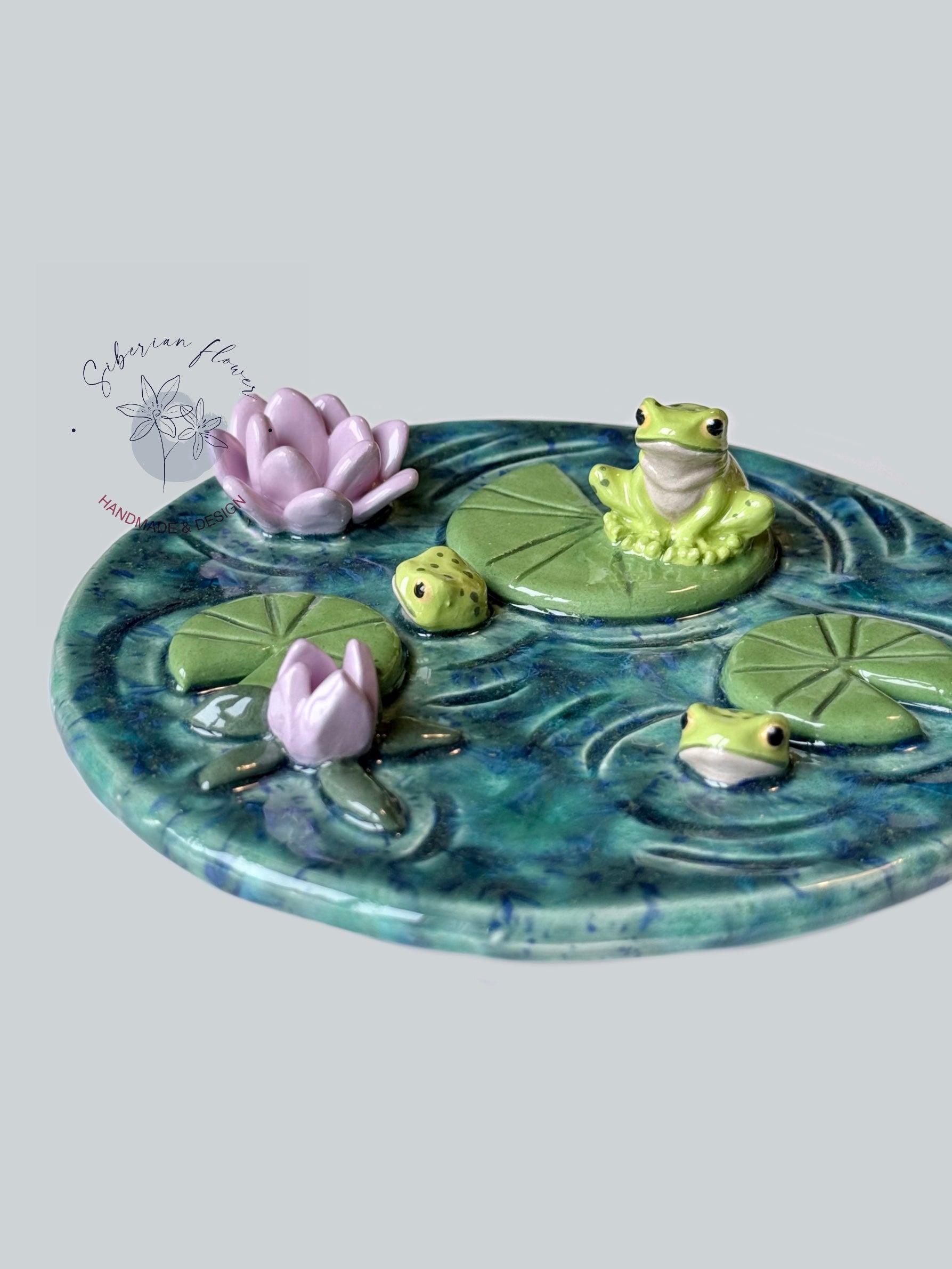 La superficie è arricchita da decorazioni floreali e vegetali, con fiori, foglie e delicate rane modellate e dipinte a mano, che evocano un immaginario naturale, fresco e poetico. Ogni dettaglio è curato singolarmente, rendendo ogni pezzo irripetibile.
