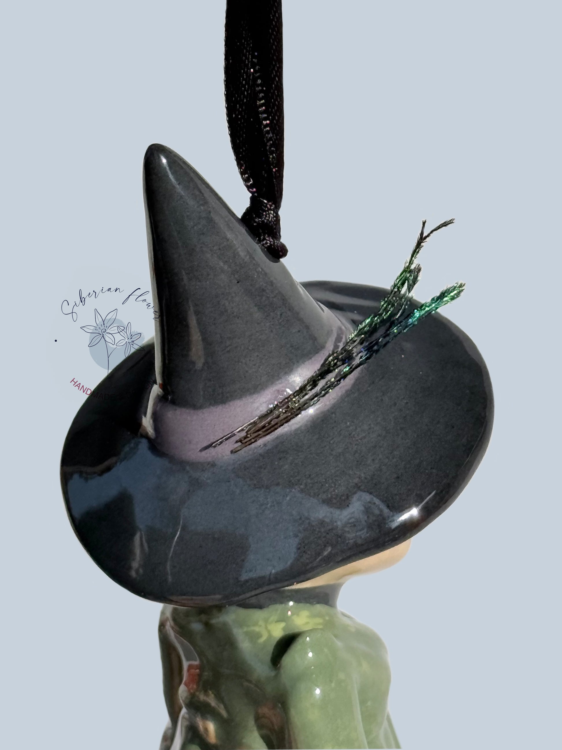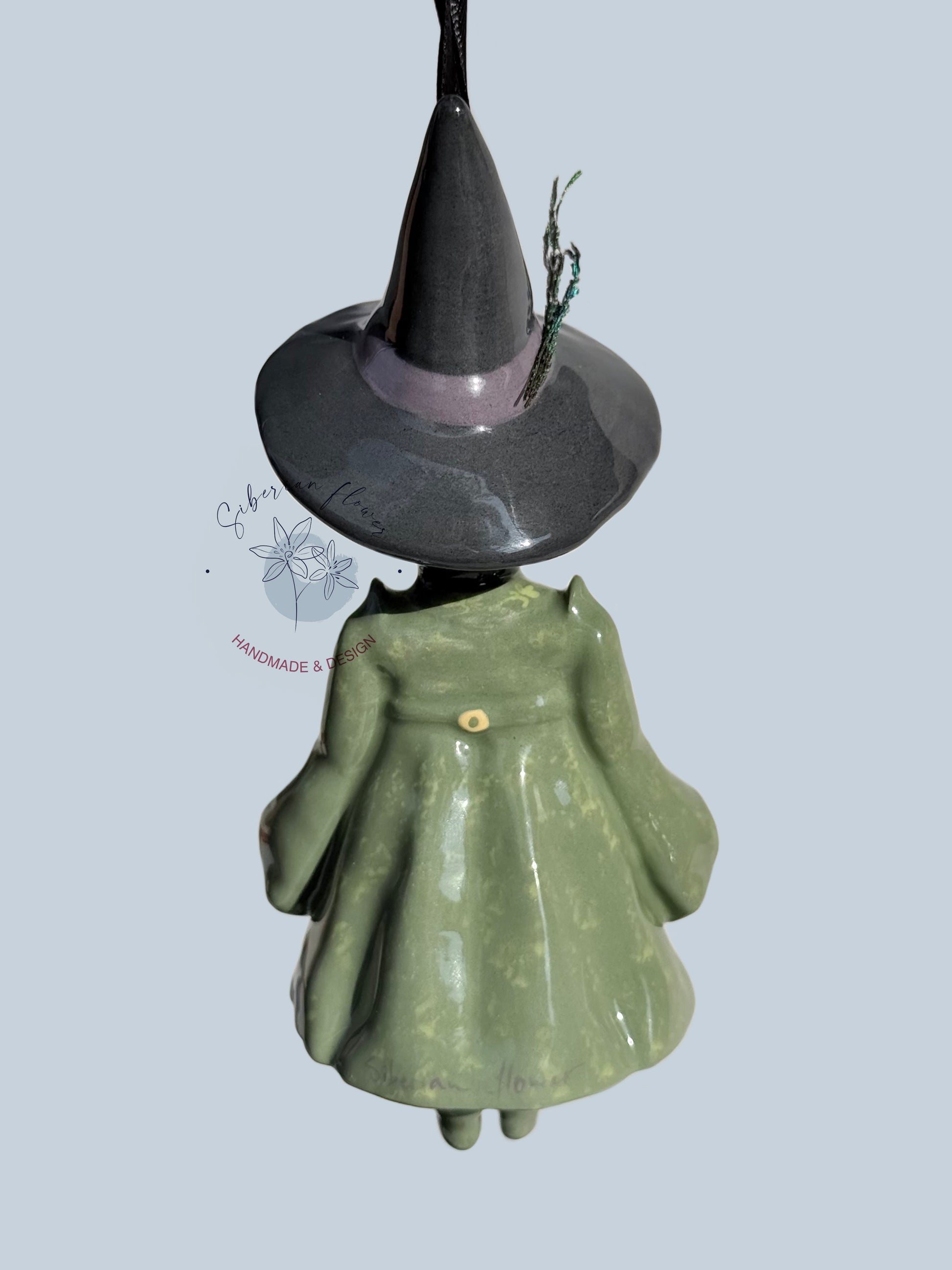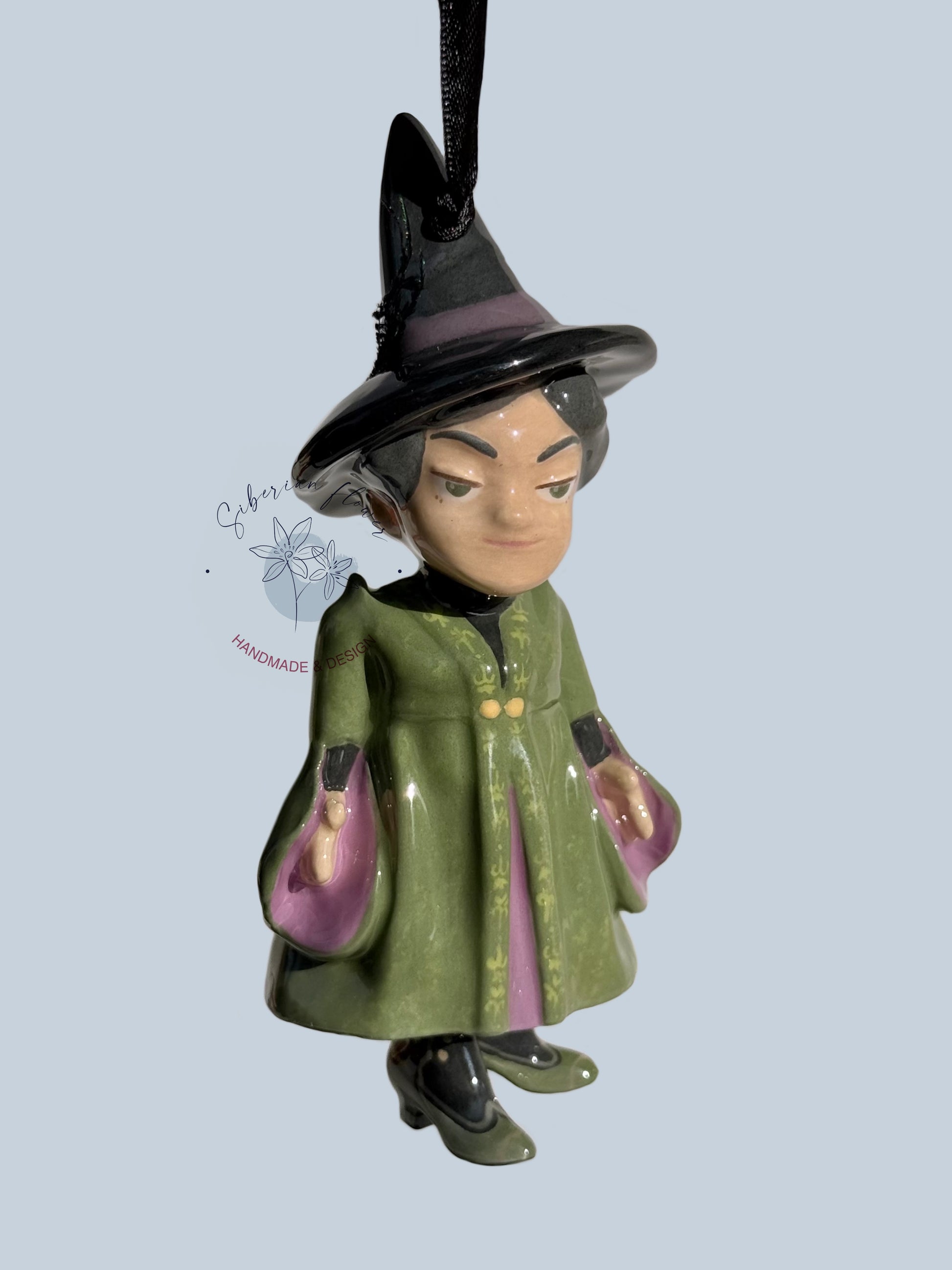 Questo campanellino in ceramica, scolpito e decorato interamente a mano nel nostro laboratorio artigianale, ritrae la professoressa con tutto il suo fascino severo e affettuoso. Indossa il suo inconfondibile abito verde smeraldo, curato nei minimi dettagli, e il cappello da strega è impreziosito da una piccola piuma vera, che aggiunge un tocco di realismo e raffinatezza.