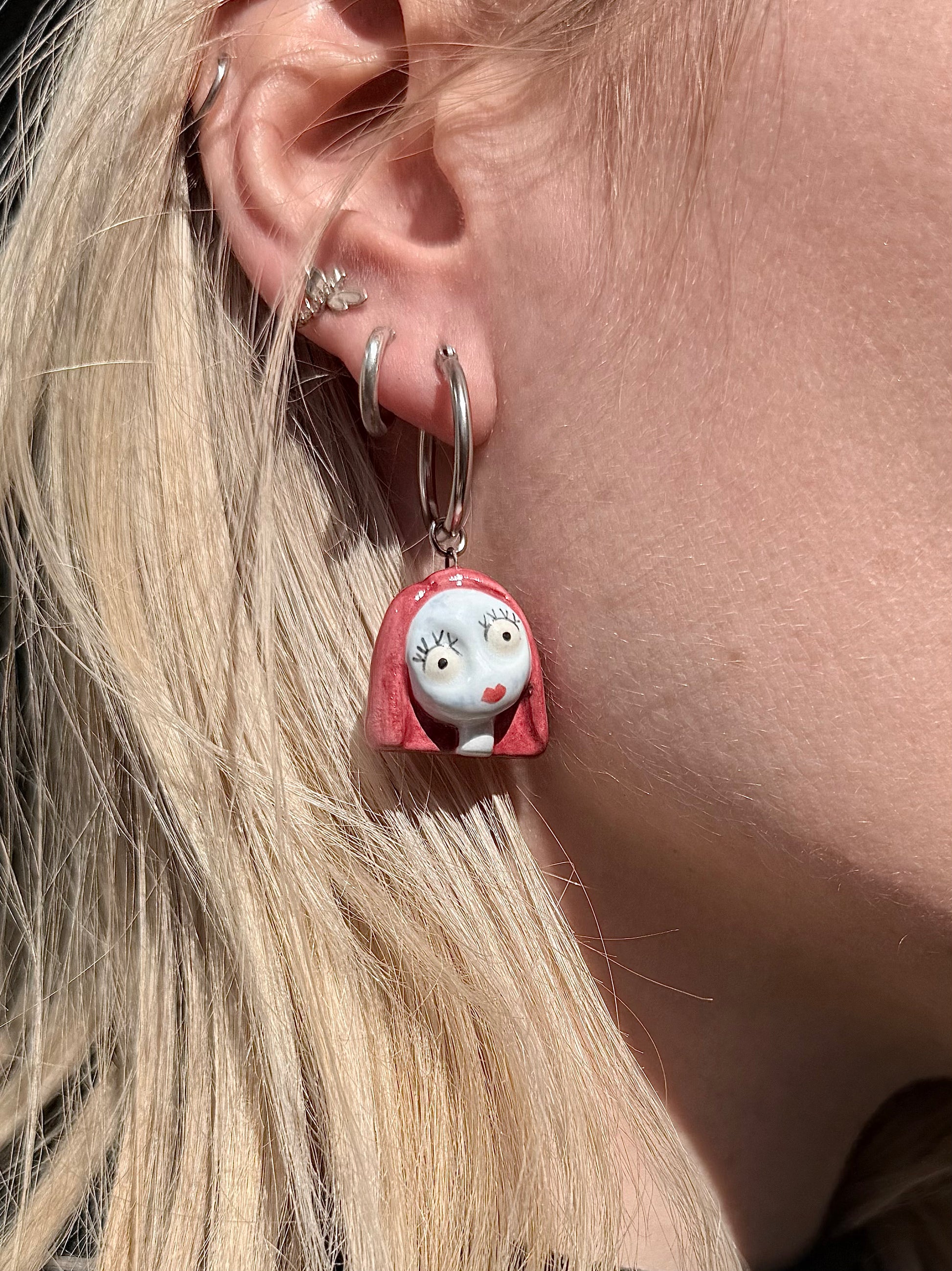 Questo orecchino in ceramica è modellato e dipinto a mano in ogni dettaglio: dal colore delicato della pelle al vivace rosso dei capelli, ogni pezzo nasce come una mini scultura tridimensionale unica e irripetibile.