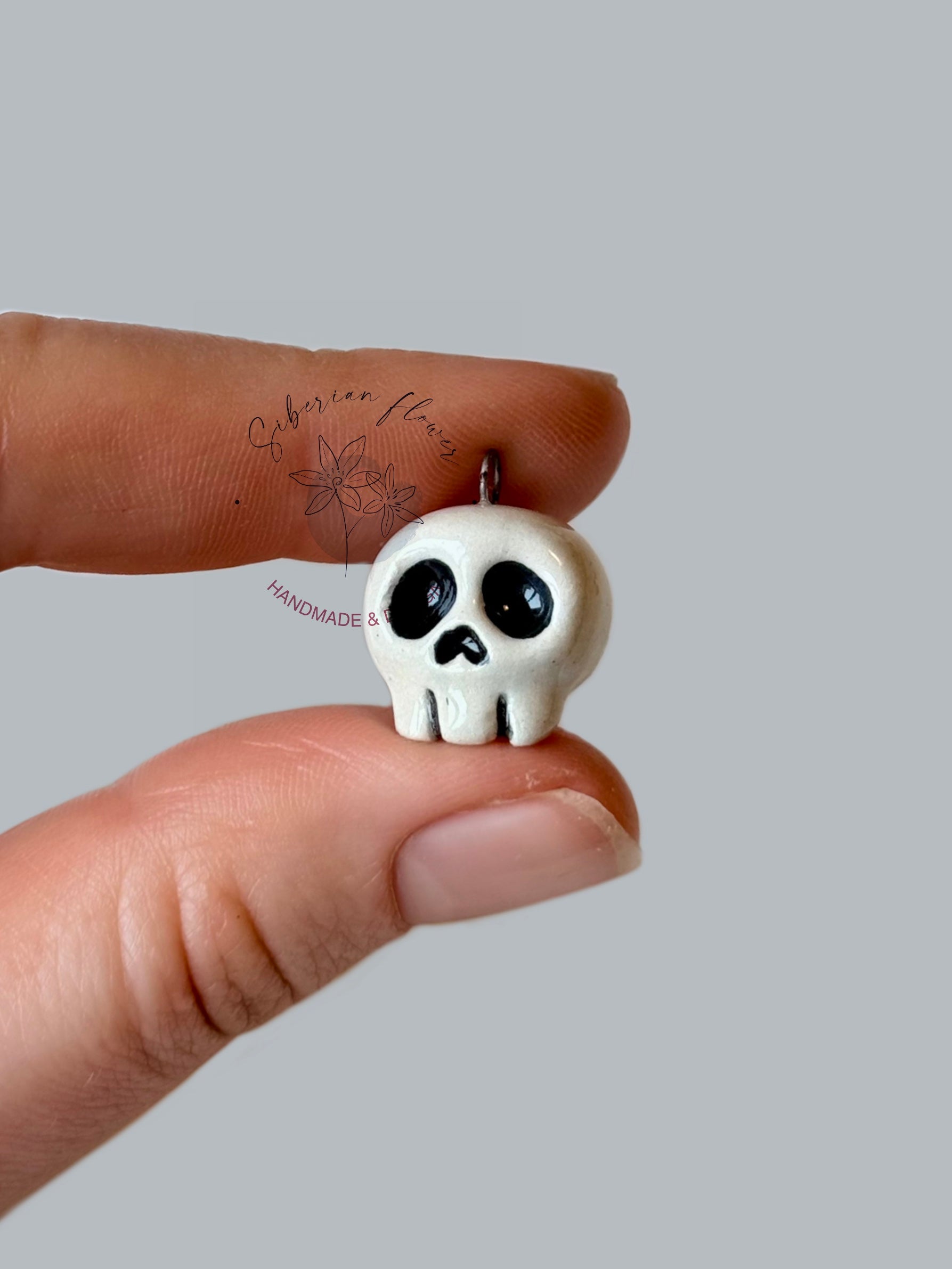 Ciondolo in ceramica artigianale fatto a mano, raffigurante un teschio in miniatura dal carattere delicato e deciso allo stesso tempo. Nonostante le dimensioni ridotte, il pezzo è ricco di dettagli: le orbite nere lucide, il naso inciso e le piccole scanalature frontali conferiscono espressività e profondità alla forma.