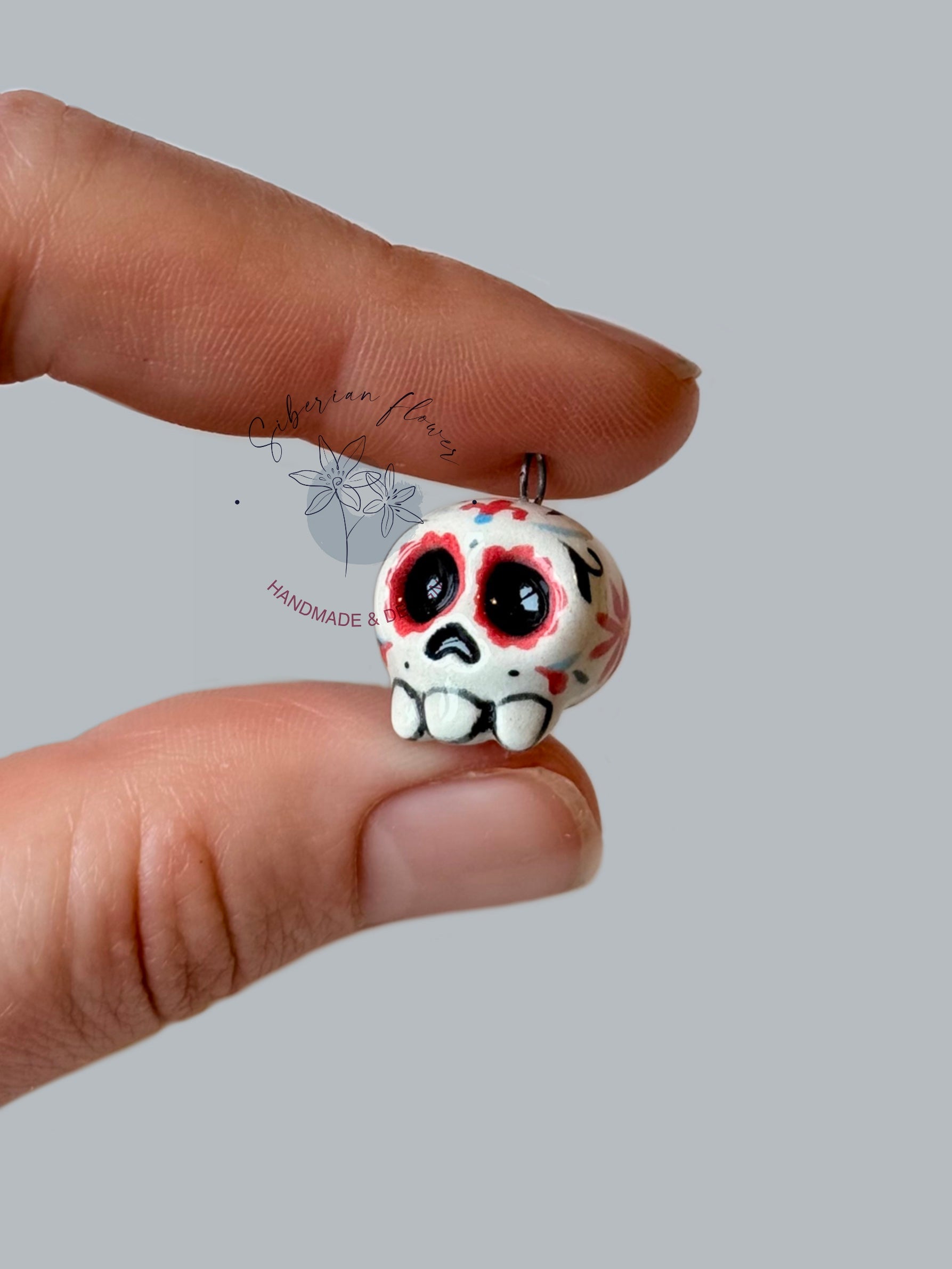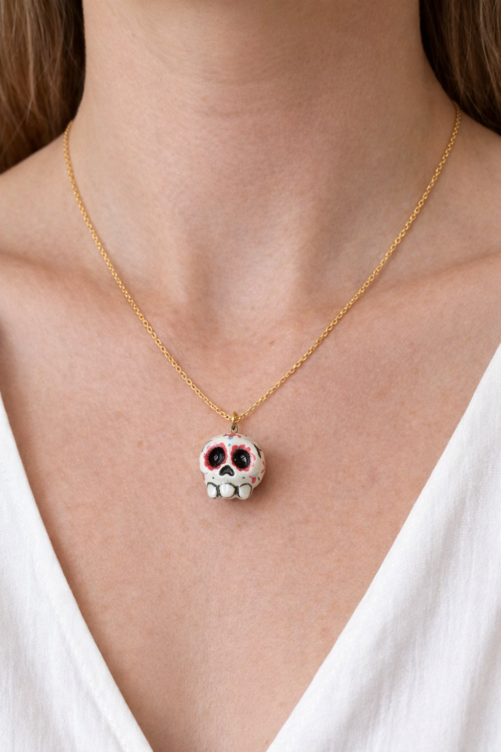 Ciondolo in ceramica artigianale fatto a mano, utilizzabile sia come ciondolo da collana sia come orecchino singolo, raffigurante un teschio in miniatura decorato nello stile della Sacra Muerte. Un piccolo gioiello dal forte valore simbolico e visivo, che unisce colore, tradizione e lavorazione artistica.